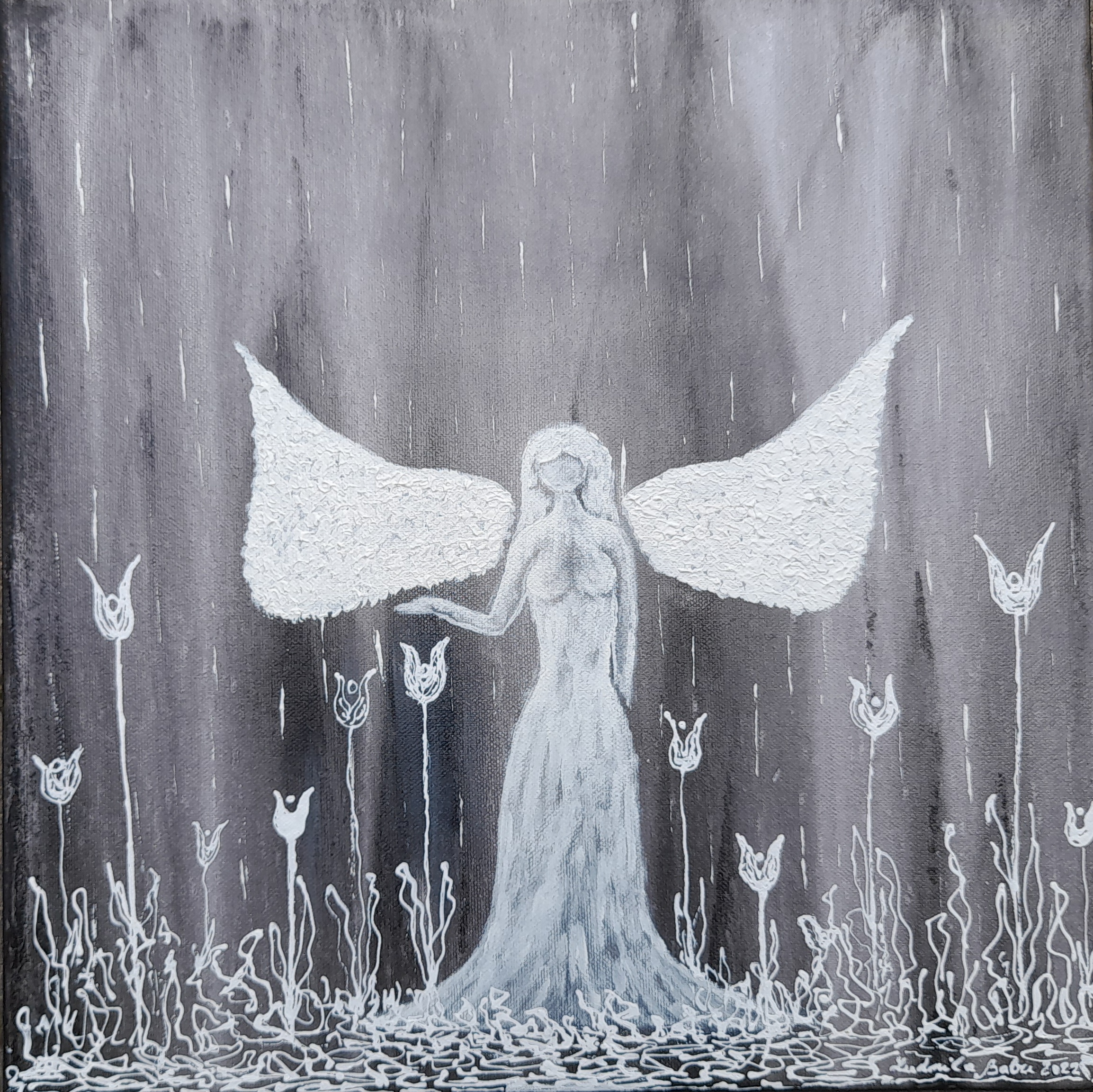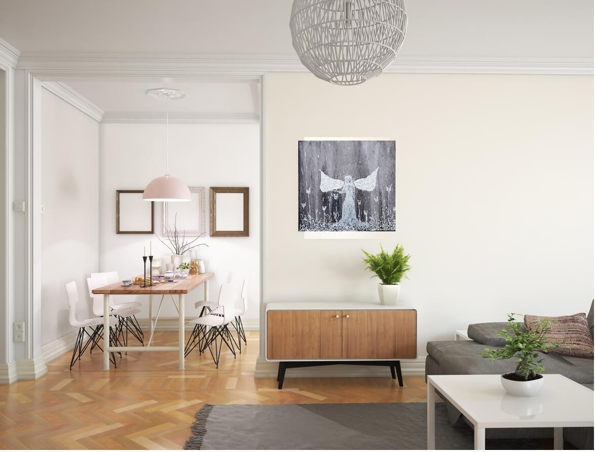 Anděl světla Akryl na plátně, lakováno Rozměr: 40 x 40 cm Signováno, rok 2022 Prodáno do soukromé sbírky Barva Bílá Šedá Interiér Dětský pokoj Ložnice Obývací pokoj Médium Akryl Styl Expresivní Téma Andělé